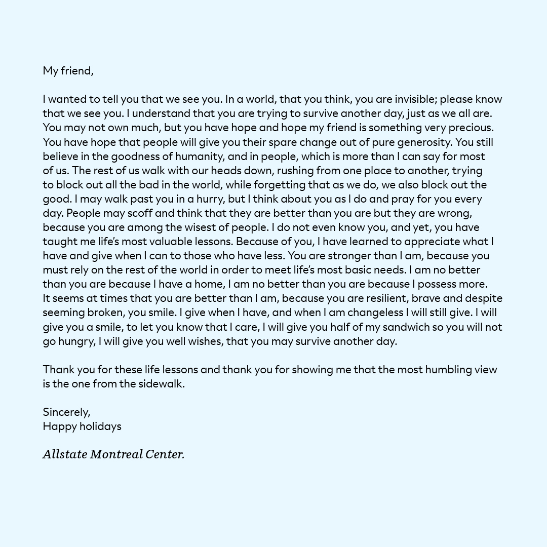In addition, we ran our Quote-for-Donations campaign where “for every quote given by our agents in Quebec between October 19 – 25, 2020”, funds were donated to the Old Brewery Mission, Espoir Rosalie in Gatineau and Fondation Lauberivière in Quebec City. Our employees also sent cards with words of encouragement for those experiencing homelessness.